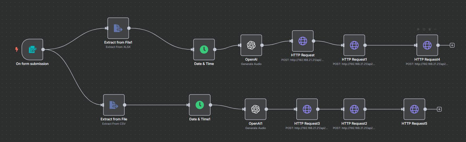 برای انجام این کار، باید یک نود جدید از نوع HTTP Request در محیط n8n ایجاد کرده و خروجی نود قبلی (که شامل id فایل صوتی آپلودشده است) را به آن متصل نمایید.